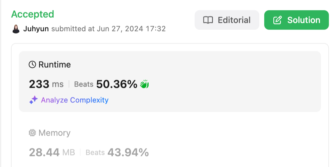 리스트를 썼을 때보다 튜플을 썼을 때 runtime이 256ms → 233ms로 줄었다.