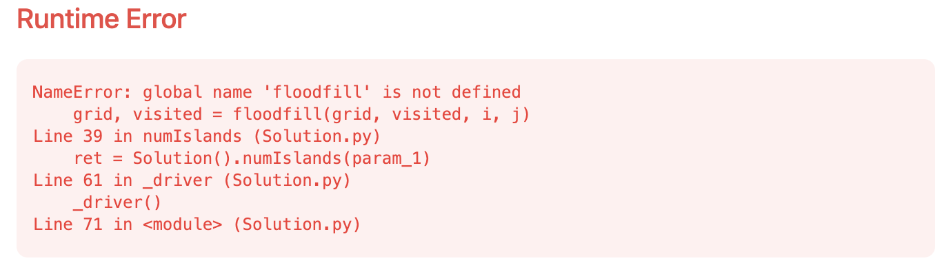 - m과 n 변수가 numIslands라는 함수 안에서 정의되어 있기 때문에 m과 n 변수도 range_check과 floodfill 함수의 파라미터로 넣어줘야 한다.